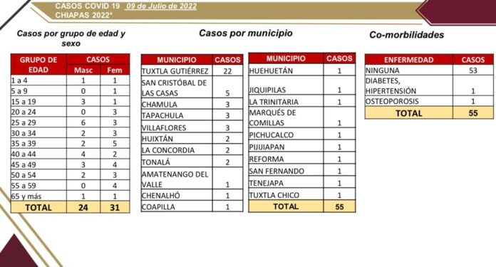 Tuxtla Gutiérrez, Chiapas; 09 de Julio del 2022.- De acuerdo al último corte del panorama epidemiológico, Chiapas registró 55 casos nuevos de COVID-19 en los municipios de Tuxtla Gutiérrez (22), San Cristóbal de Las Casas (5), Chamula (3), Tapachula (3), Villaflores (3), Huixtán (2), La Concordia (2), Tonalá (2), Amatenango del Valle (1), Chenalhó (1), Coapilla (1), Huehuetán (1), Jiquipilas (1), La Trinitaria (1), Marqués de Comillas (1), Pichucalco (1), Pijijiapan (1), Reforma (1), San Fernando (1), Tenejapa (1) y Tuxtla Chico (1), sin reporte de fallecimientos por esta enfermedad respiratoria.
