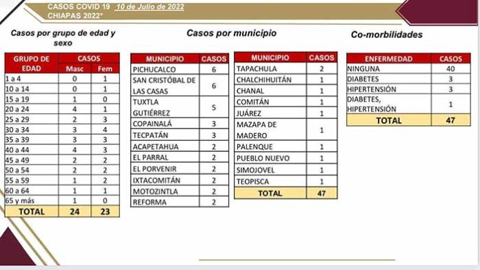 Tuxtla Gutiérrez, Chiapas; 10 de Julio del 2022.- La Secretaría de Salud de Chiapas cerró este fin de semana con 47 casos positivos de COVID-19 en los municipios de Pichucalco (6), San Cristóbal de Las Casas (6), Tuxtla Gutiérrez (5), Copainalá (3), Tecpatán (3), Acapetahua (2), El Parral (2), El Porvenir (2), Ixtacomitán (2), Motozintla (2), Reforma (2), Tapachula (2), Chalchihuitán (1), Chanal (1), Comitán de Domínguez (1), Juárez (1), Mazapa de Madero (1), Palenque (1), Pueblo Nuevo (1), Simojovel (1) y Teopisca (1); sin registro de defunciones por esta enfermedad respiratoria.