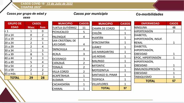 Tuxtla Gutiérrez, Chiapas; 13 de julio del 2022.- La Secretaría de Salud del estado informó que en las últimas 24 horas se han registrado 57 casos nuevos de COVID-19 en los municipios de Tuxtla Gutiérrez (11), Pichucalco (5), Palenque (4), San Cristóbal de Las Casas (4), Tapachula (4), Acala (3), Ocosingo (3), Catazajá (2), Tonalá (2), Villa Corzo (2), Acapetahua (1), Aldama (1), Cacahoatán (1), Chanal (1), Chiapa de Corzo (1), Chilón (1), Huixtán (1), Ixtacomitán (1), Juárez (1), Las Margaritas (1), Las Rosas (1), Malpaso (1), Mitontic (1), Motozintla (1), Santiago el Pinar (1), Teopisca (1) y Villaflores (1); sin reporte de defunciones por COVID-19.