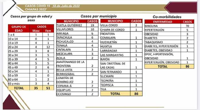 Tuxtla Gutiérrez, Chiapas; 18 de Julio de 2022.- De acuerdo con el panorama epidemiológico COVID-19, la Secretaría de Salud del Estado reporta este inicio de semana 86 casos positivos en la entidad.
