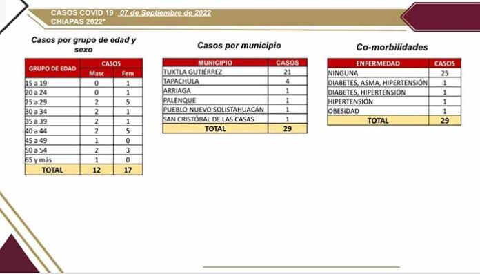 Los casos nuevos se reportaron en los siguientes seis municipios: Tuxtla Gutiérrez, 21; Tapachula, cuatro; y con uno, Arriaga, Palenque, Pueblo Nuevo Solistahuacán y San Cristóbal de Las Casas.
