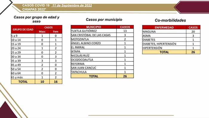 Tuxtla Gutiérrez, Chiapas; 11 de septiembre de 2022.- La Secretaría de Salud del estado informó que en las últimas horas Chiapas cierra la semana manteniendo la tendencia a la baja con tan sólo 26 casos nuevos de COVID-19 en 11 municipios de la entidad, sin registro de defunciones por esta enfermedad respiratoria.