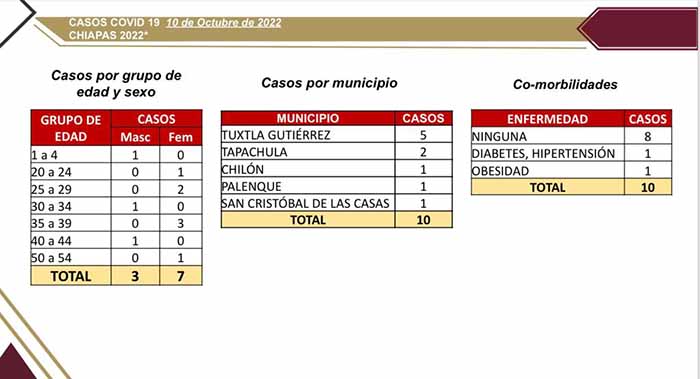 Tuxtla Gutiérrez, Chiapas; 10 de Octubre de 2022.- De acuerdo con el último corte del panorama epidemiológico de COVID-19, Chiapas presentó 10 casos nuevos en cinco municipios de la entidad, donde sólo dos pacientes padecen diabetes, hipertensión y obesidad, y el resto no cuenta con comorbilidades; además de sumar un día más sin registro de defunciones por esta enfermedad.