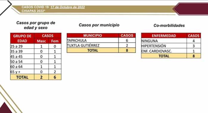 Tuxtla Gutiérrez, Chiapas; 17 de Octubre de 2022.- De acuerdo con el último corte del panorama epidemiológico, Chiapas presentó sólo ocho casos nuevos de COVID-19, seis en Tapachula y dos en Tuxtla Gutiérrez, sin registro de defunciones por esta enfermedad respiratoria.