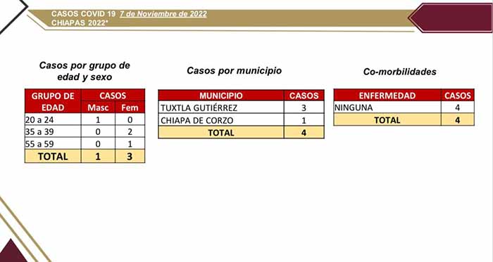Tuxtla Gutiérrez, Chiapas; 07 de Noviembre de 2022.- La Secretaría de Salud del Estado informó que en las últimas 24 horas se registraron tan sólo cuatro casos nuevos de COVID-19: tres en Tuxtla Gutiérrez y uno en Chiapa de Corzo; sin reporte de fallecimientos por esta enfermedad respiratoria.