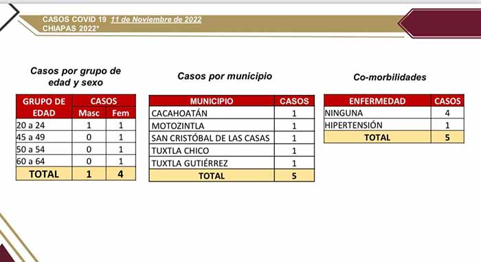 Tuxtla Gutiérrez, Chiapas; 11 de Noviembre de 2022.- El Laboratorio Estatal de Salud Pública confirmó en las últimas horas cinco muestras positivas a COVID-19, en personas mayores de 20 años de edad, da a conocer la Secretaría de Salud de Chiapas.