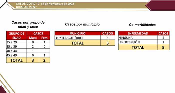 La dependencia estatal informó que la positividad se registró en dos mujeres y tres hombres, de 25 a 49 años de edad; donde sólo una persona cuenta con hipertensión arterial y el resto no tiene ninguna enfermedad crónica degenerativa.