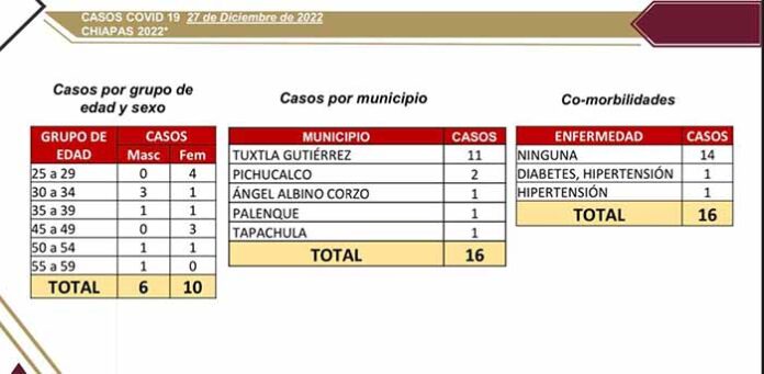 Tuxtla Gutiérrez, Chiapas; 27 de diciembre de 2022.- En las últimas 24 horas, Chiapas registra 16 casos nuevos de COVID en cinco municipios de la entidad.