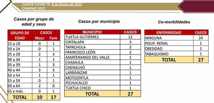 Tuxtla Gutiérrez, Chiapas; 08 de Enero de 2023.- En Chiapas se reportaron 27 casos nuevos de COVID-19 en las últimas horas: 12 en Tuxtla Gutiérrez, tres en Cintalapa y Tapachula, dos en Francisco León, así como un caso en Amatenango del Valle, Chamula, Chenalhó, Larráinzar, Motozintla, Pichucalco y Tuxtla Chico; sin registro de muertes por esta enfermedad respiratoria, dio a conocer la Secretaría de Salud estatal.