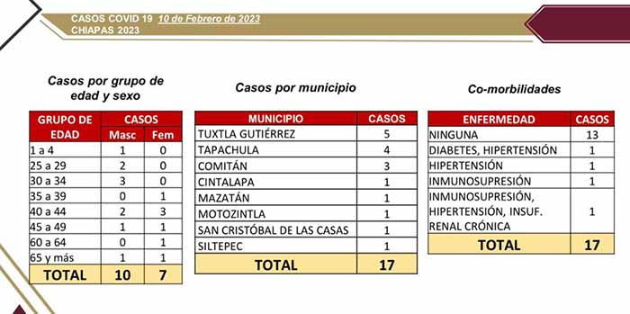 Tuxtla Gutiérrez, Chiapas; 10 de Febrero de 2023.- La Secretaría de Salud estatal comunica que en las últimas horas se detectaron 17 casos de COVID-19 en ocho municipios de la entidad chiapaneca; sin la confirmación de defunciones.