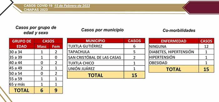 Tuxtla Gutiérrez, Chiapas; 15 de febrero de 2023.- De acuerdo con el último panorama epidemiológico, Chiapas registró 15 casos nuevos de COVID-19: seis en Tuxtla Gutiérrez, cinco en Tapachula, dos en San Cristóbal de Las Casas, uno en Tuxtla Chico y uno en Unión Juárez; sin reporte de defunciones por esta enfermedad.