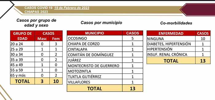 Tuxtla Gutiérrez, Chiapas; 19 de Febrero de 2023.- Chiapas registra 13 casos nuevos de COVID-19 en las últimas 24 horas, en nueve municipios, donde sólo tres pacientes padecen de enfermedades crónicas como hipertensión arterial, diabetes e insuficiencia renal, informó la Secretaría de Salud estatal.