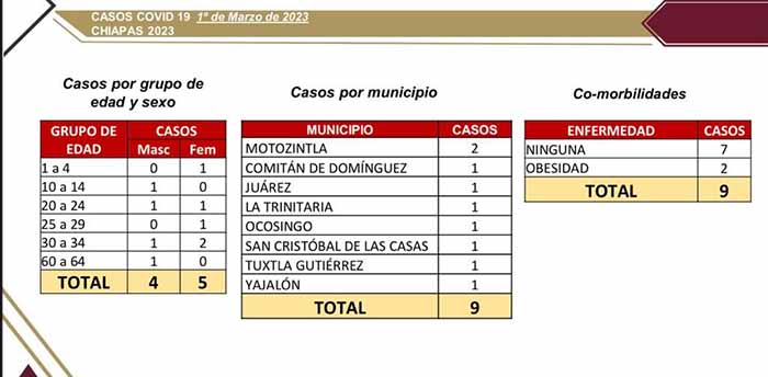 Tuxtla Gutiérrez, Chiapas; 01 de marzo de 2023.- La Secretaría de Salud del estado anunció que suman nueve casos nuevos de COVID-19 en la entidad chiapaneca, de acuerdo con el último panorama epidemiológico, en los siguientes municipios: dos en Motozintla, así como un caso en Comitán, Juárez, La Trinitaria, Ocosingo, San Cristóbal de Las Casas, Tuxtla Gutiérrez y Yajalón; sin presentar muertes por esta enfermedad.