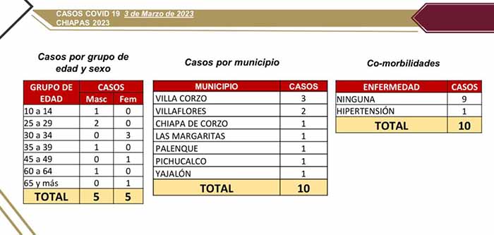 Tuxtla Gutiérrez, Chiapas; 03 de Marzo de 2023.- Con tan sólo 10 casos nuevos de COVID-19 en siete municipios, Chiapas se mantiene a la baja en contagios por esta enfermedad, notificando tres en Villa Corzo, dos en Villaflores, así como un caso en los municipios de Chiapa de Corzo, Las Margaritas, Palenque, Pichucalco y Yajalón; sin registro de defunciones, dio a conocer la Secretaría de Salud del estado.