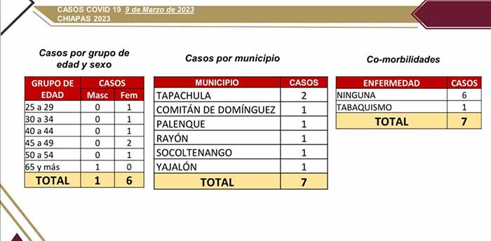 Tuxtla Gutiérrez, Chiapas; 09 de Marzo de 2023.- La Secretaría de Salud del Estado anunció siete casos nuevos de COVID-19, en las últimas 24 horas: dos en Tapachula, así como uno en Comitán, Palenque, Rayón, Socoltenango y Yajalón; sin registro de muertes por esta enfermedad.