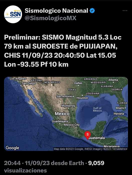 De acuerdo con el Sismológico Nacional, el fenómeno natural tuvo origen a 79 kilómetros al suroeste de Pijijiapan, por el momento la dependencia no ha informado sobre la duración del temblor.