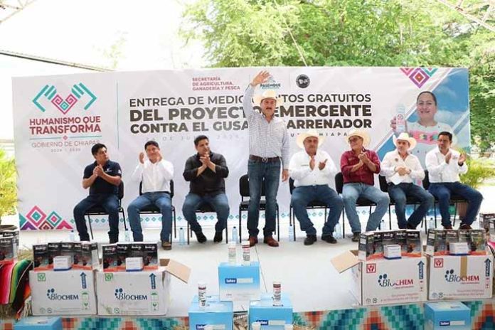 Palenque, Chiapas.- El Gobierno del Estado, a través de la Secretaría de Agricultura, Ganadería y Pesca (SAGyP) reforzó la estrategia sanitaria contra el gusano barrenador del ganado, con la entrega de medicamentos gratuitos para más de 150 mil cabezas de ganado en seis municipios del norte de Chiapas: Palenque, Benemérito de las Américas, Catazajá, La Libertad, Salto de Agua y Marqués de Comillas.