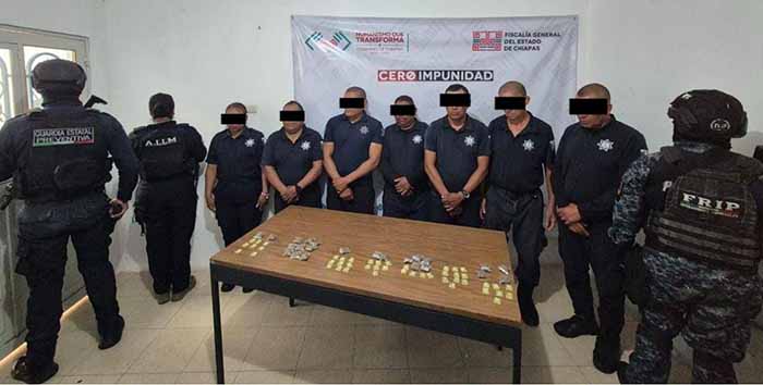Con el fin de hacer cumplir la ley y garantizar el Estado de Derecho de la ciudadanía chiapaneca, guardias estatales detuvieron a los policías municipales de nombre Misael “N”, Juan “N”, Samuel “N”, Hugo “N”, Óscar “N”, Roberto “N” y Jacqueline “N”, mismos que fueron denunciados por dedicarse a la venta y distribución de presuntos narcóticos.