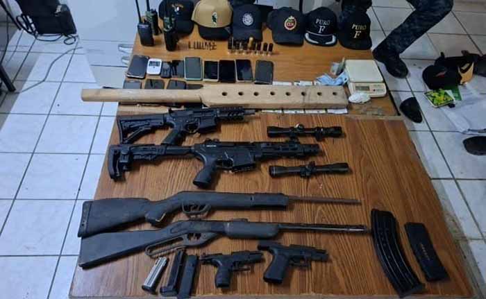 Como resultado de lo anterior, fueron localizados y asegurados siete vehículos, divisas de diferentes denominaciones, armas cortas y largas, cartuchos, cargadores y una bolsa que contenía una sustancia con características similares a la cocaína.