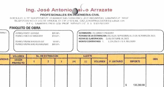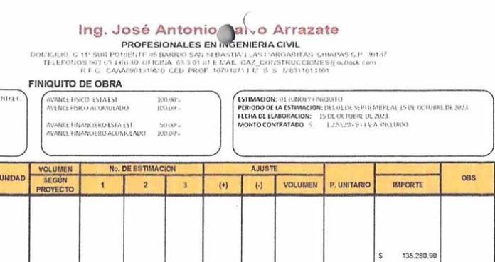 Otro señalamiento recurrente es que el 90 por ciento de la obra pública de Unión Juárez no se asigna a empresas locales, sino que es ejecutada por una compañía externa, identificada como “Profesionales en Ingeniería Civil”, encabezada por el ingeniero José “N”, con domicilio en el Barrio San Sebastián, en el municipio de Las Margaritas.