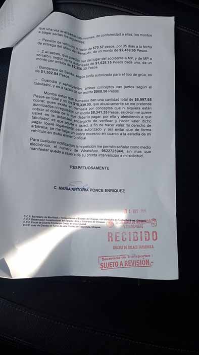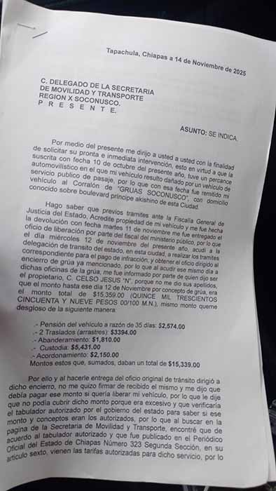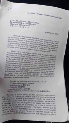Hasta la fecha, el funcionario no ha intervenido, no ha verificado el cobro arbitrario ni ha intentado mediar con el propietario del encierro, dejando a los ciudadanos en total indefensión y permitiendo que el corralón siga operando bajo sus propias reglas, ignorando las tarifas oficiales establecidas por ley y publicadas en el Periódico Oficial de Chiapas.