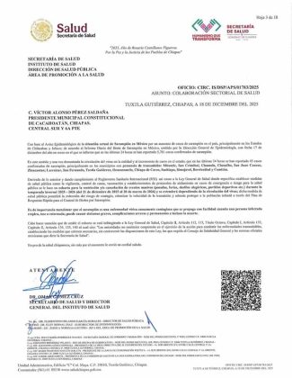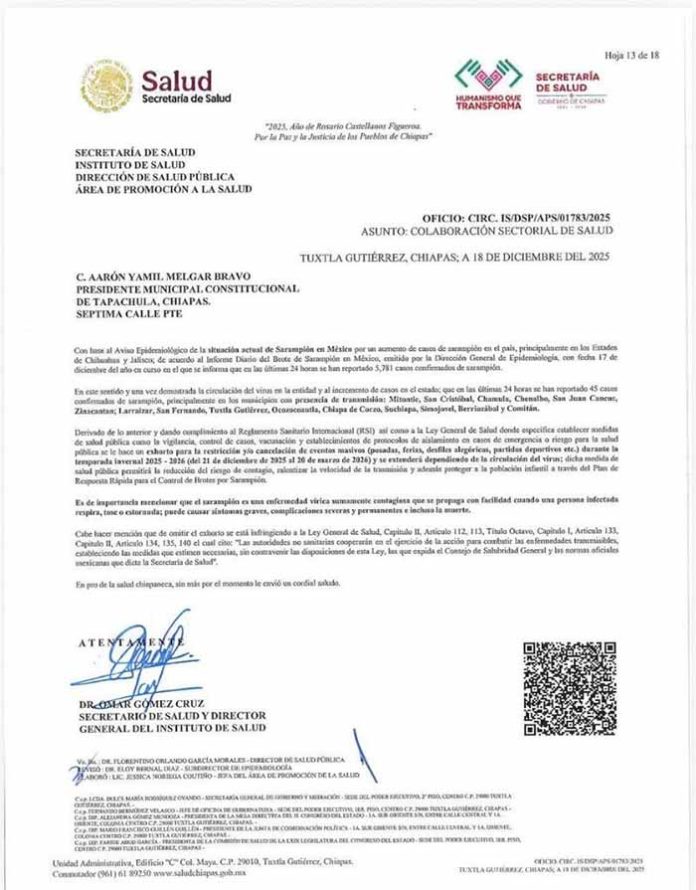 En la circular IS/DSP/APS/017883/2025, la Secretaría de Salud en Chiapas, asegura que son 15 los municipios de Chiapas, con 45 casos: Mitontic, San Cristóbal, San Juan Chamula, Chenalhó, San Juan Cancuc, Zinacantán, San Andrés Larráinzar, San Fernando, Tuxtla, Ocozocoautla, Chiapa de Corzo, Suchiapa, Simojovel, Berriozal y Comitán.