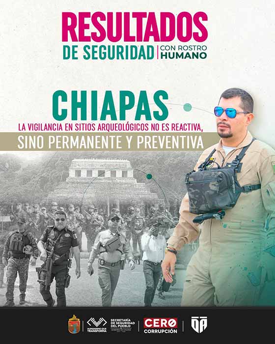 Tuxtla Gutiérrez, Chiapas; 26 de Abril de 2026.- En la Nueva ERA, bajo la visión del gobernador del Estado, Eduardo Ramírez Aguilar, y el liderazgo del secretario de Seguridad del Pueblo, Óscar Alberto Aparicio Avendaño, en Chiapas la vigilancia en sitios arqueológicos y espacios turísticos no es reactiva, sino permanente y preventiva, porque hoy la tranquilidad y el bienestar de las y los visitantes nacionales, locales y extranjeros, es prioridad.