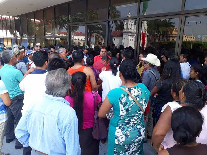 Tapachula, Chiapas; 4 de Abril.- Cientos de ejidatarios y avecindados de la comunidad “Viva México”, ubicado en la entrada poniente al municipio, protestaron este jueves en la Presidencia Municipal por la imposición que, aseguran, está haciendo el Gobierno que encabeza el alcalde Oscar Gurría Penagos, en torno a sus autoridades.