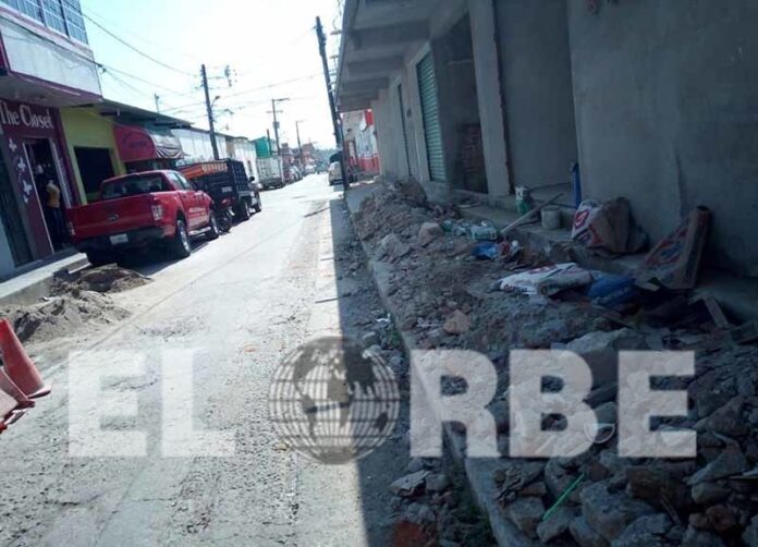 Huixtla, Chiapas; 17 de febrero de 2021.- Trabajadores de la construcción laboran en casa y locales comerciales ubicados en la Avenida González Ortega entre calle Madero y calle Iturbide, en los últimos días han iniciado la mala costumbre de arrojar escombros en las banquetas, obligando a los transeúntes a tener que bajarse a la calle para poder seguir su camino, con lo cual exponen sus vidas.
