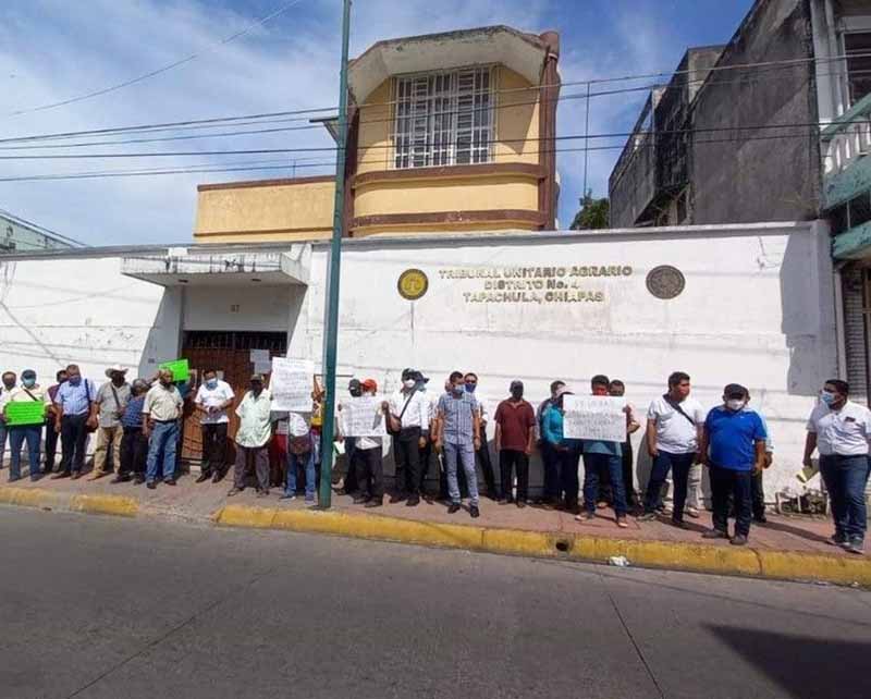 Tapachula, Chiapas; 05 de abril del 2021.- Representantes ejidales y de comunidades rurales de este municipio protestaron este día en las afueras del Tribunal Agrario Federal, al sur de la ciudad, porque señalan que los asuntos jurídicos se encuentran paralizados en más de un año.