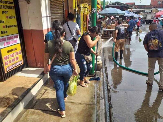 Tapachula, Chiapas; 04 de junio del 2021.- Locatarios del mercado San Juan, en la localidad, se han sumado a realizar actividades de limpieza en sus calles, sus alrededores y al interior de esas instalaciones, para hacer un frente común en contra del mortal virus del Covid-19.