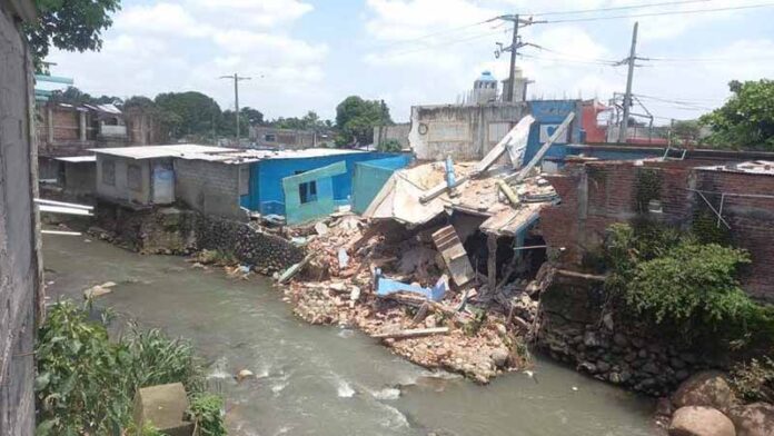 Tapachula, Chiapas; 18 de Julio del 2021.- En la mañana de este domingo cuatro viviendas ubicadas en la ribera del río Texcuyuapan, en la colonia San Miguel, terminaron desplomadas y otras más corren el mismo riesgo, luego que se derrumbara parte del muro de contención y el caudal del afluente ha socavado por debajo de las casas.