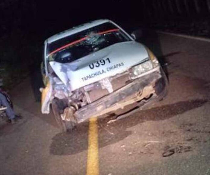Tapachula, Chiapas; 25 de Julio de 2021.- Conductores que transitaban sobre la carretera que conduce de Tapachula a Nueva Alemania, se percataron que a la altura del ejido Independencia se encontraba un vehículo habilitado como taxi severamente dañado y abandonado.