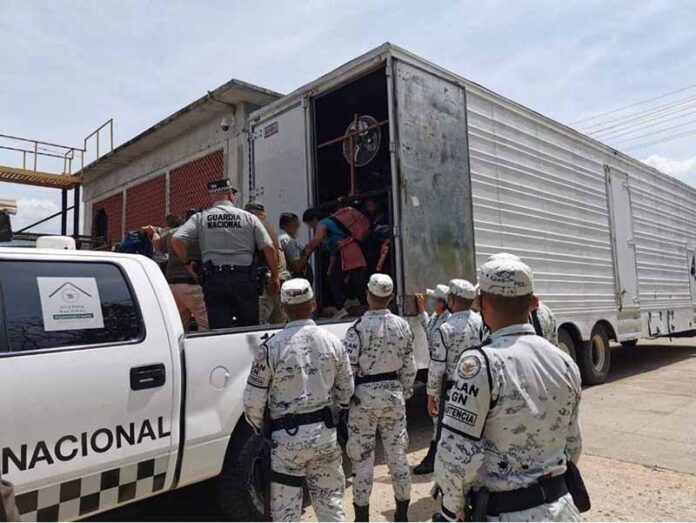 Tapachula, Chiapas; 06 de Agosto del 2021.- Elementos de la Guardia Nacional y del Instituto Nacional de Migración (INM) detuvieron un tráiler en cuya caja llevaba a 93 indocumentados de diversas nacionalidades en condiciones deplorables, incluidos a 63 niños.