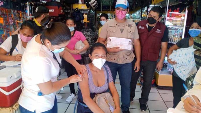 Tapachula, Chiapas.- El Ayuntamiento de Tapachula a través de la Secretaría de Servicios Públicos se sumó a las acciones de vacunación contra el Covid-19, para lo cual este domingo se instalaron puestos de atención en los mercados de la Ciudad.