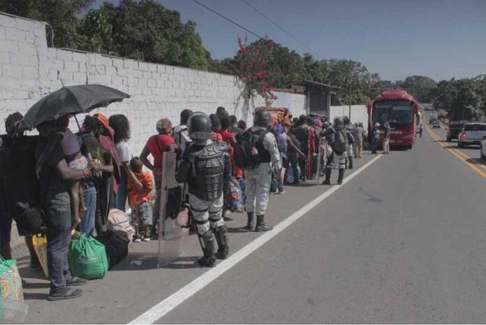 También hay la presencia de elementos de la Guardia Nacional (GN) con equipos antimotines, para evitar el desorden; además, agentes del Instituto Nacional de Migración (INM) que coordinan el traslado.