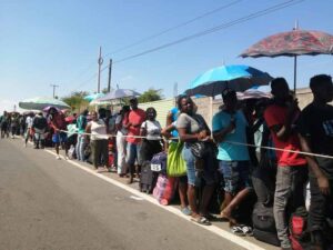 La fila -de varios kilómetros de largo- inicia desde el Centro de Orientación y Apoyo para Migrantes Una Luz del Camino Sin Fronteras, hasta la entrada de la colonia “Los Palacios”, da vuelta y sigue hasta la base de las colectivas del fraccionamiento “Los Laureles”.