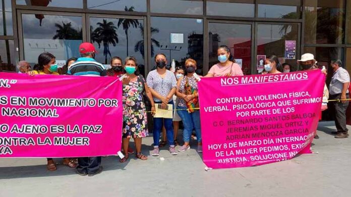 Tapachula, Chiapas; 08 de marzo del 2022.- Un grupo de mujeres del predio El Alazán, ubicado al norte de la ciudad, se manifestaron este día en el Palacio Municipal de esta ciudad, solicitando apoyo a las autoridades ante el ataque que aseguran sufren por parte de un grupo de invasores.