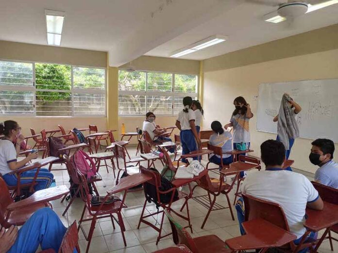 Tan solo en esa secundaria hay alrededor de 800 alumnos en al turno matutino y unos 400 en el vespertino. El retorno a las presenciales ha sido bajo el formato híbrido, es decir, una semana asiste la mitad, mientras el resto recibe la enseñanza de manera virtual. EL ORBE / JC