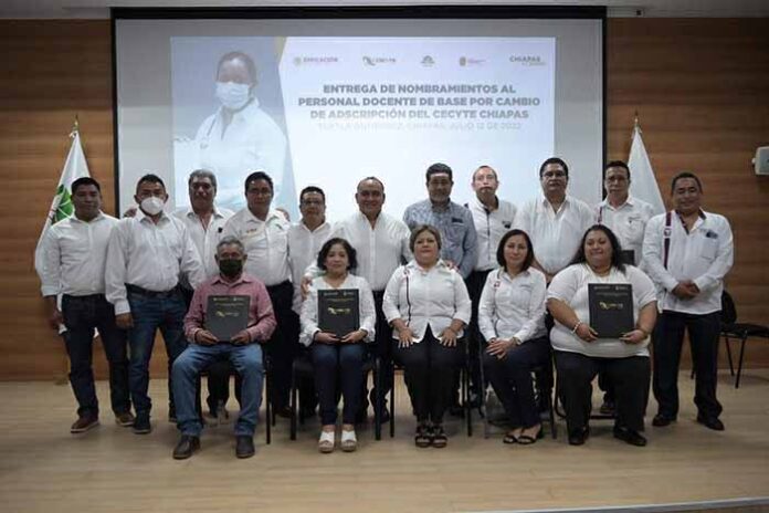 Tapachula, Chiapas; 14 de julio del 2022.- El director general y coordinador estatal del Colegio de Estudios Científicos y Tecnológicos y Telebachilleratos de Chiapas (CECyTE-TBC Chiapas), Sandro Hernández Piñón, encabezó la entrega de nombramientos a las y los docentes de base por cambio de adscripción.
