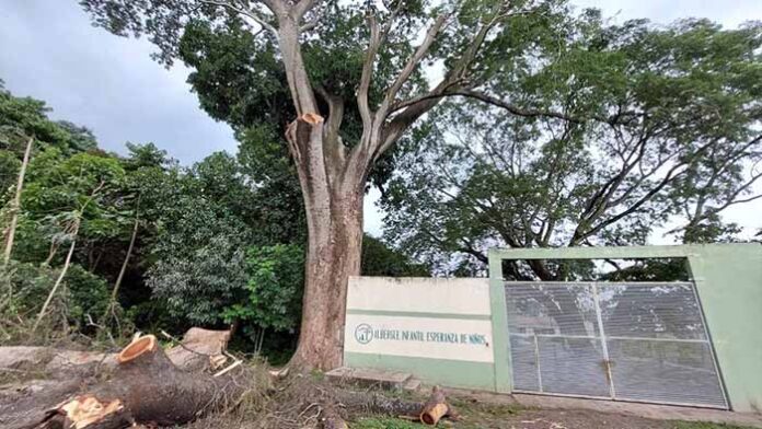 Tapachula, Chiapas; 01 de Septiembre del 2022.- Sin que les corresponda, personal de un albergue ubicado en el kilómetro 9.5 de la carretera a Puerto Madero, intentó derribar un milenario árbol de Guanacaste, con el argumento de que constituye un peligro.