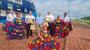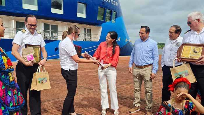 En representación de la presidenta municipal de Tapachula, Rosa Irene Urbina Castañeda, la secretaria de Economía y Turismo Municipal, Sheyla Horita Ocampo, dio la bienvenida al crucero que por vez primera atraca en tierras chiapanecas.