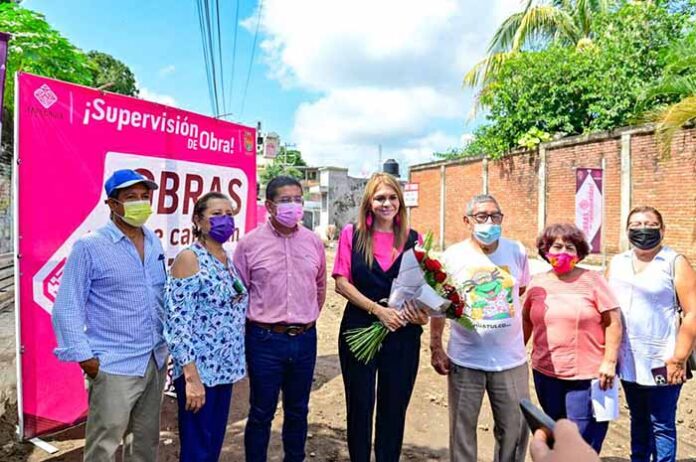 Acompañada de los vecinos y del secretario de Obras Públicas Municipales, Jorge Luis Flores Ozuna, la Alcaldesa constató el avance en el 50 por ciento de los trabajos que consisten en mil 41 metros cuadrados de pavimento hidráulico que corresponden a 109 metros lineales, además de guarniciones, banquetas, señalización, obras Inducidas, entre ellas, la red de alcantarillado, descargas sanitarias, red de distribución y tomas domiciliarias.