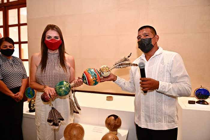 La secretaria de Educación y Cultura, Cinthia Guadalupe González López, explicó que en la exposición se presentan artesanías elaboradas por integrantes del Colectivo Xóchilt y otros artistas, quienes aprovechan en forma integral el huacal para la elaboración de diversos objetos, entre ellos lámparas, muñecas y alhajas. EL ORBE / Comunicado de Prensa