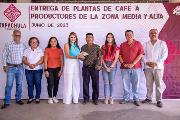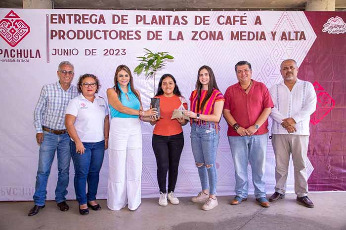 Tapachula, Chiapas; 17 de junio del 2023.- Con un llamado a fortalecer el cultivo de café respetando el medio ambiente y su entorno natural, la alcaldesa de Tapachula, Rosa Irene Urbina Castañeda, hizo entrega de 7 mil 500 plantas del aromático grano a 60 productores de la zona media y alta del municipio.