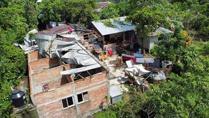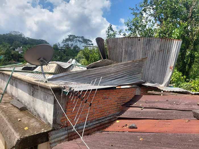 Tapachula, Chiapas; 19 de junio del 2023.- En las últimas horas se registró un aguacero acompañado de fuertes vientos en la zona alta de éste municipio, dejando como saldo más de 40 viviendas afectadas en el techo.