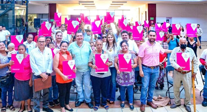 Tapachula, Chiapas; 20 de junio del 2023.- Al hacer entrega de 50 escrituras públicas en beneficio de igual número de familias de 11 colonias, quienes ya gozan de seguridad jurídica de su patrimonio, la presidenta municipal de Tapachula, Rosa Irene Urbina Castañeda, reiteró el compromiso de continuar avanzando en la regularización de la tenencia de la tierra.