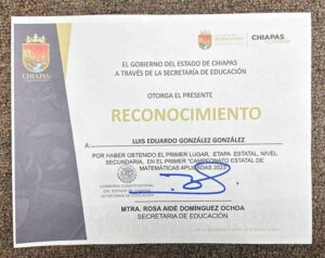 Tapachula, Chiapas; 04 de Julio del 2023.- Luis Eduardo González González, alumno de tercero de secundaria del instituto Cumbres, de éste municipio, obtuvo el primer lugar en la categoría de matemáticas en la Olimpiada de Conocimientos, en su fase estatal, celebrada esta semana en la capital del Estado.