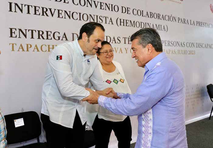 El acto estuvo presidido por el Dr. Rutilio Escandón Cadenas, Gobernador del Estado de Chiapas, y el secretario de Salud, Losé Antonio Pepe Cruz, importantes personajes de la iniciativa pública y personal de “Ciudad Salud”, para la puesta en marcha de la Hemodinámica, así también en la entrega de ayudas técnicas a personas con discapacidad en la región X Soconusco.