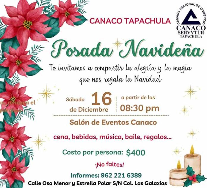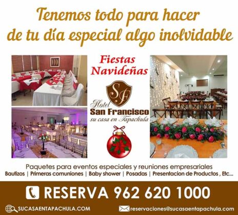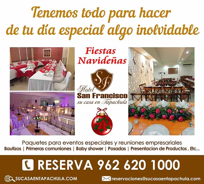 Celebra tus Fiestas y Posadas en los Salones del Hotel San Francisco, y Restaurante Veranda, pregunta por los paquetes de servicios que más se ajusten a tu presupuesto. Canaco Tapachula te invita a disfrutar de su ¡Tradicional Posada Navideña!, además te ofrece en renta, sus salones para eventos especiales. ¡Vive la magia que nos regala la Navidad!